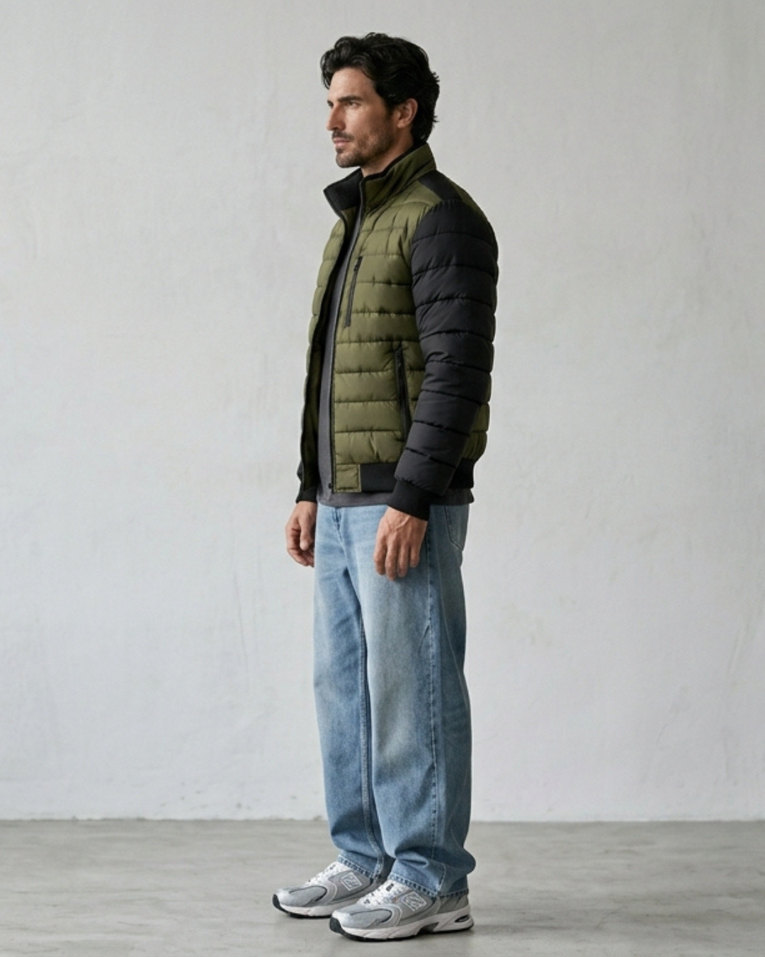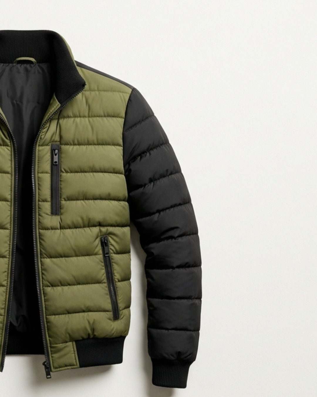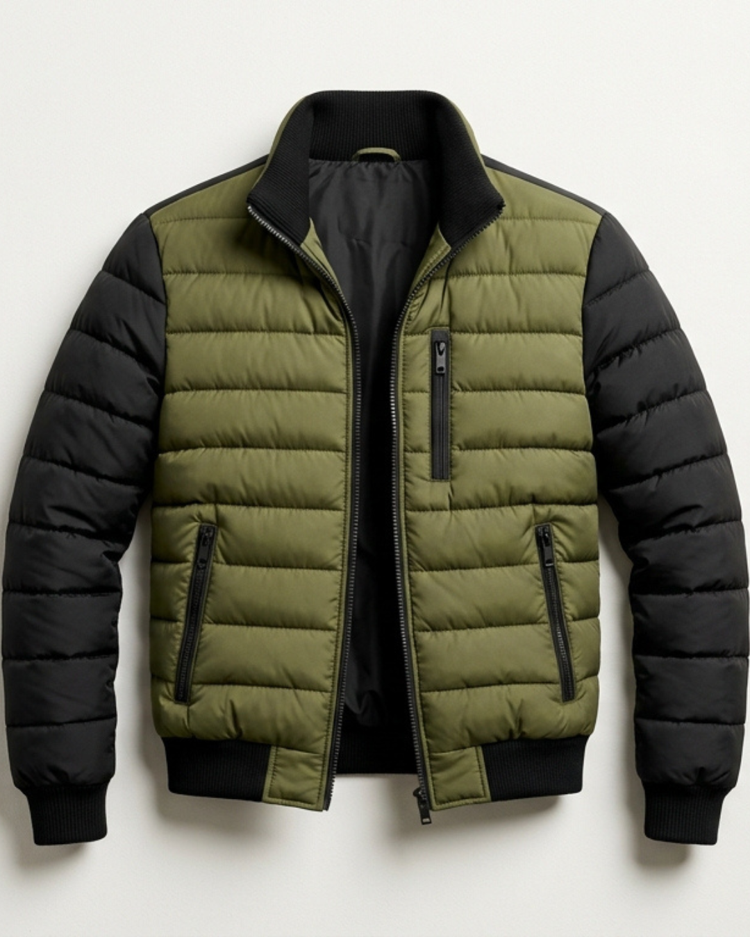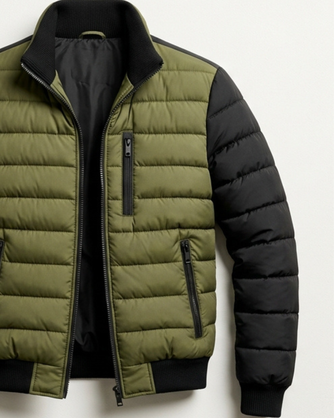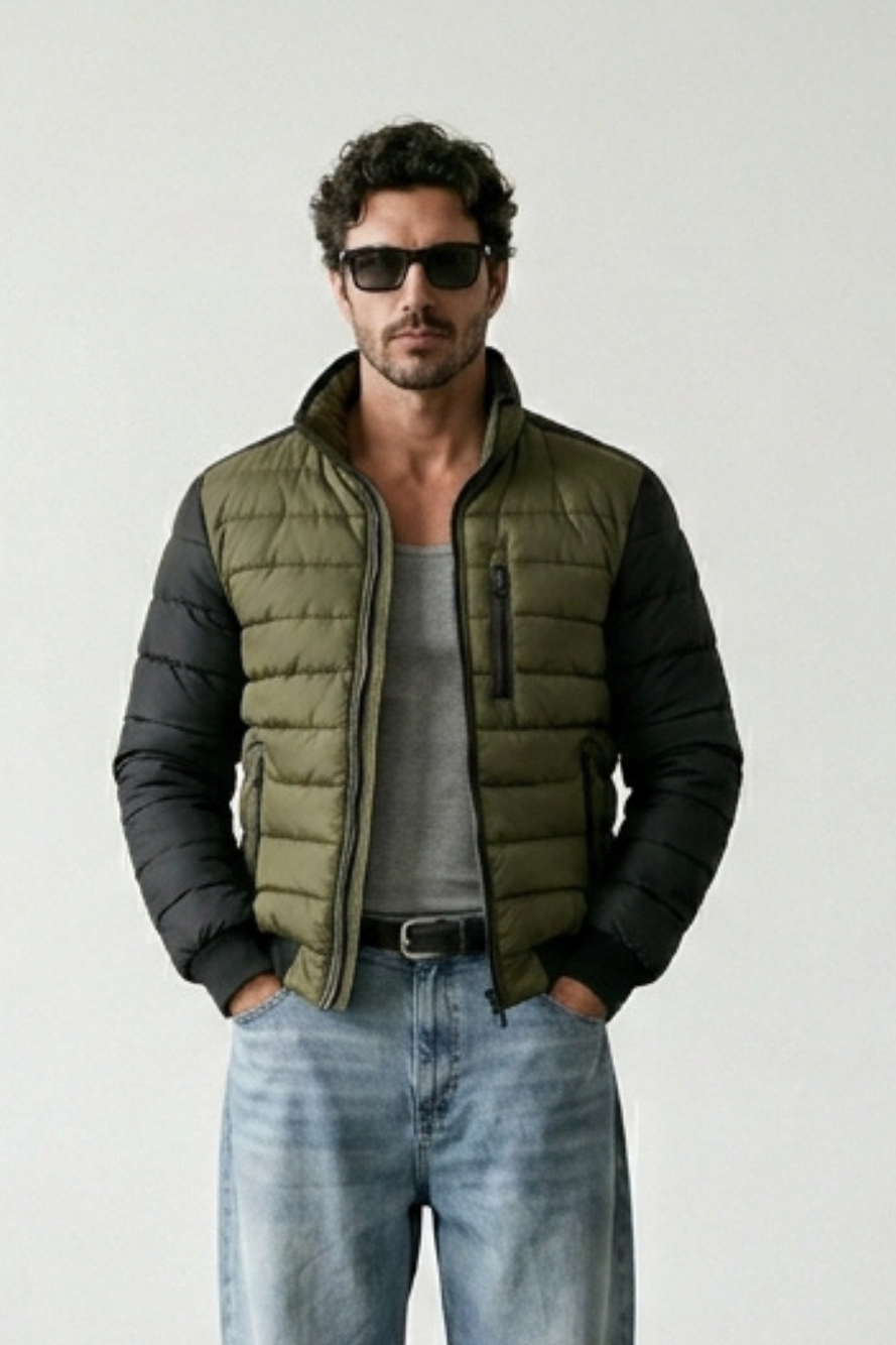 Esta chaqueta combina un cuerpo acolchado en color verde oliva con mangas negras en contraste.