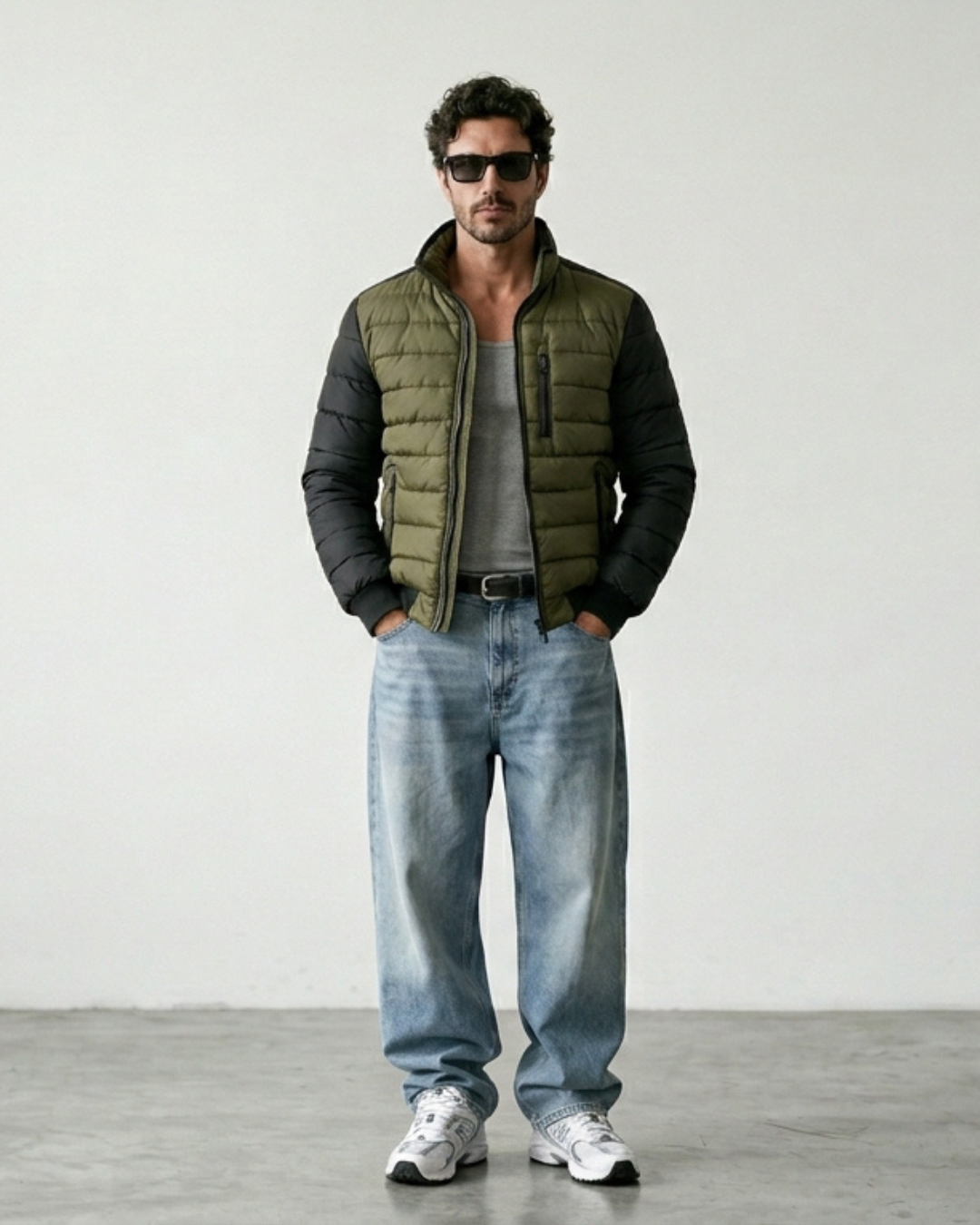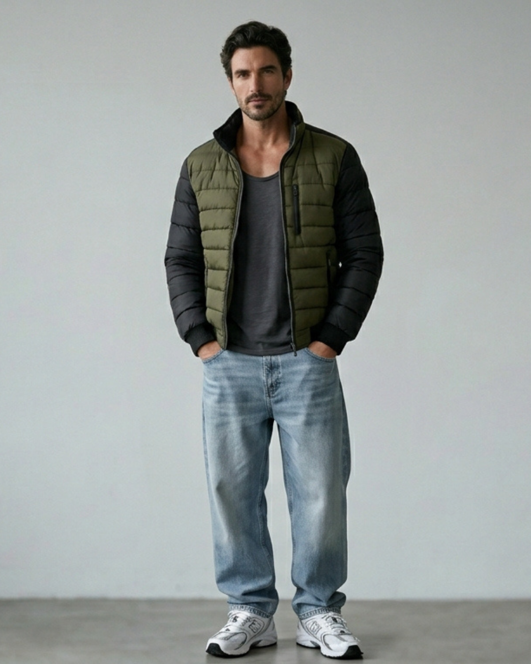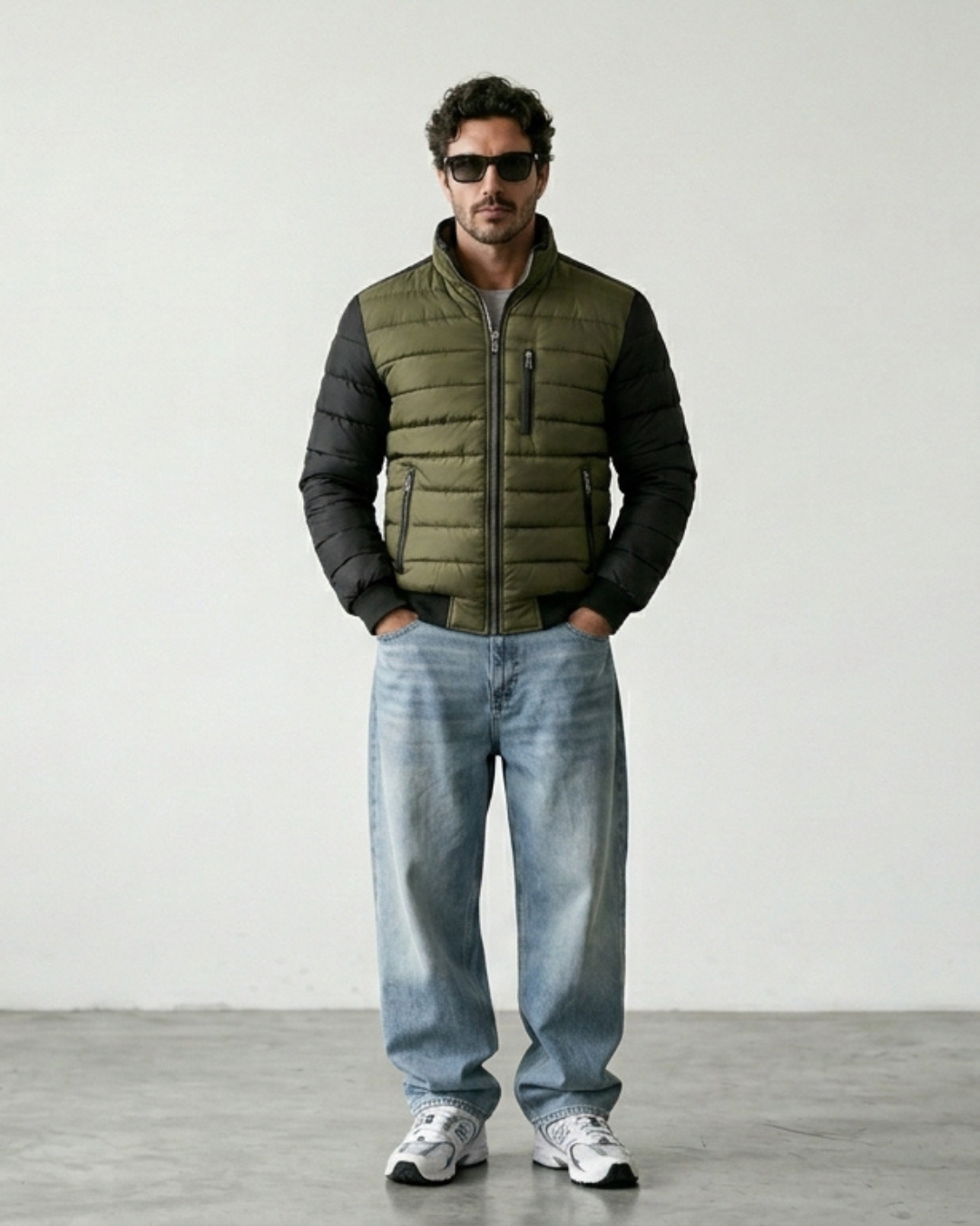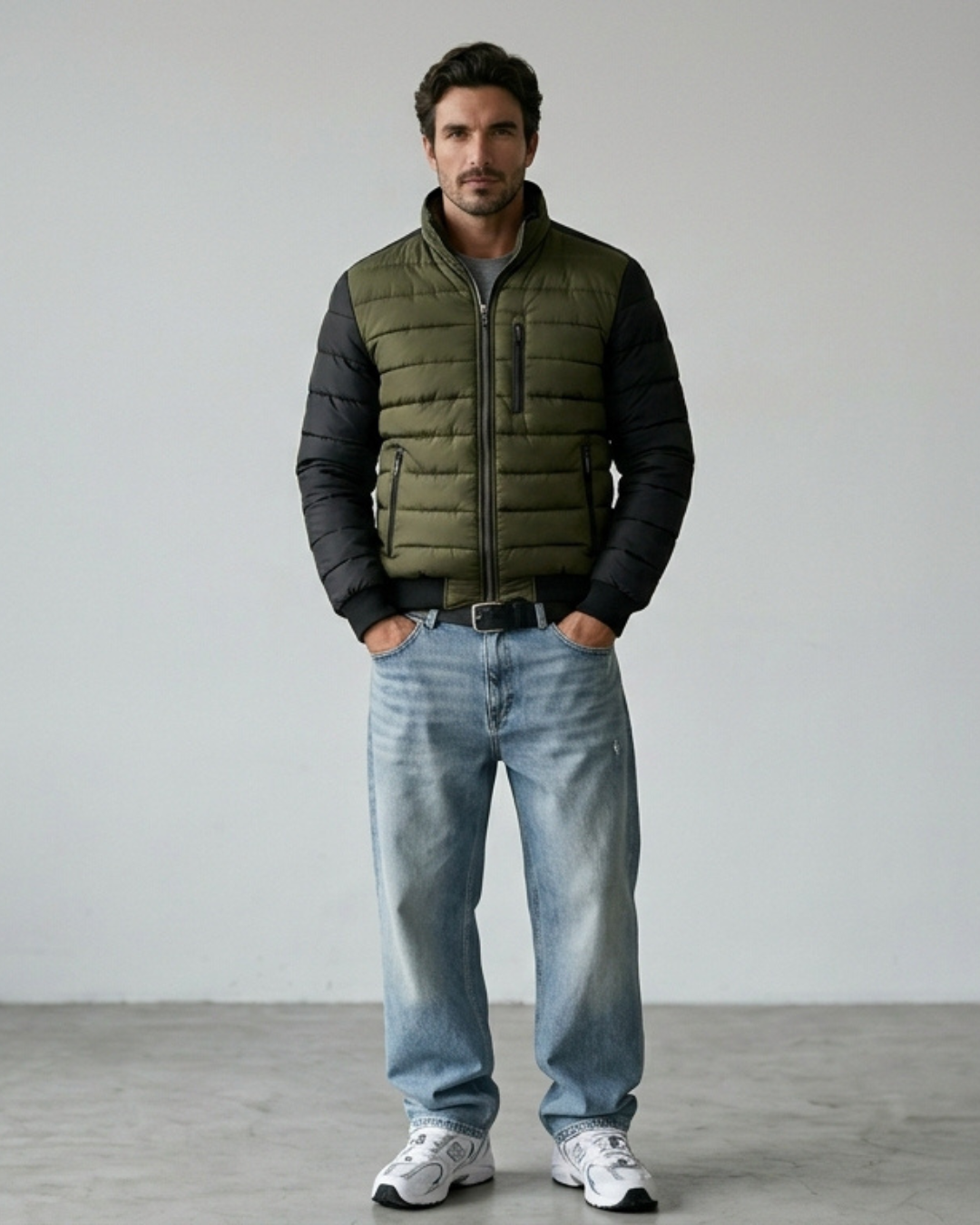 Esta chaqueta combina un cuerpo acolchado en color verde oliva con mangas negras en contraste.