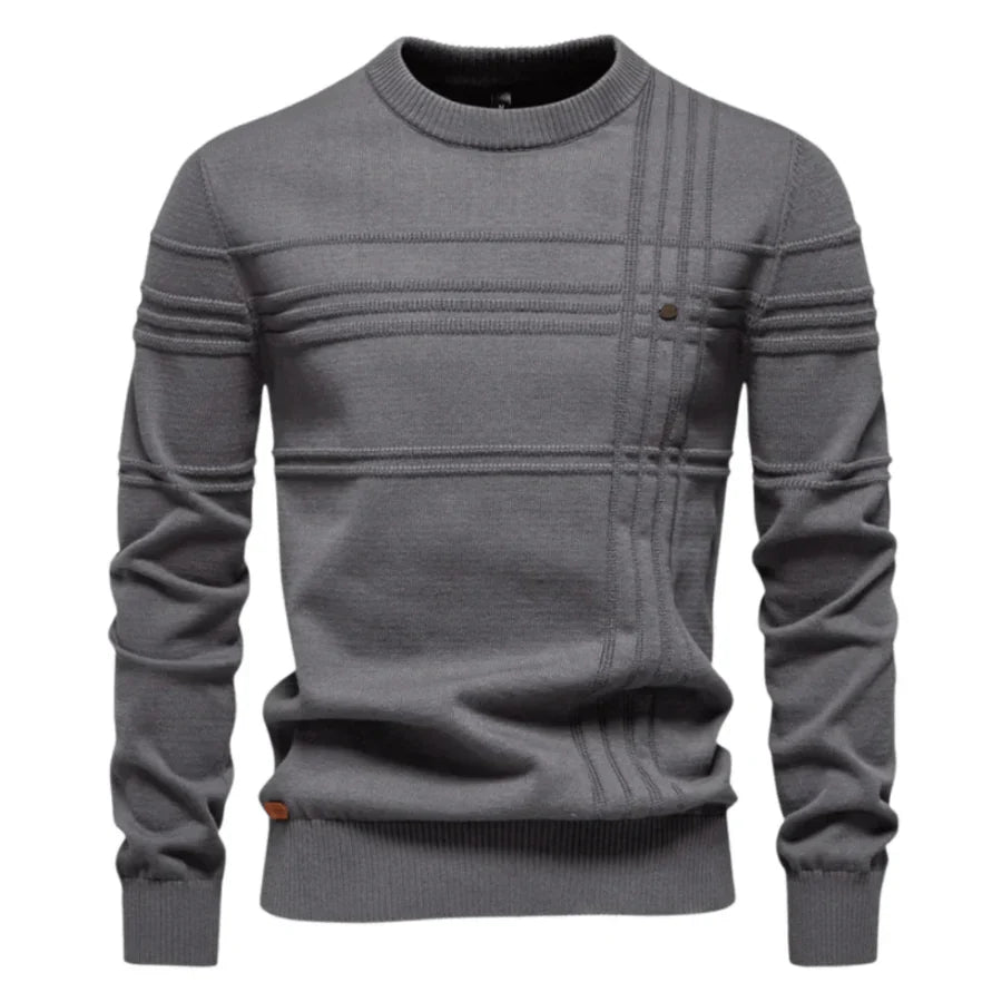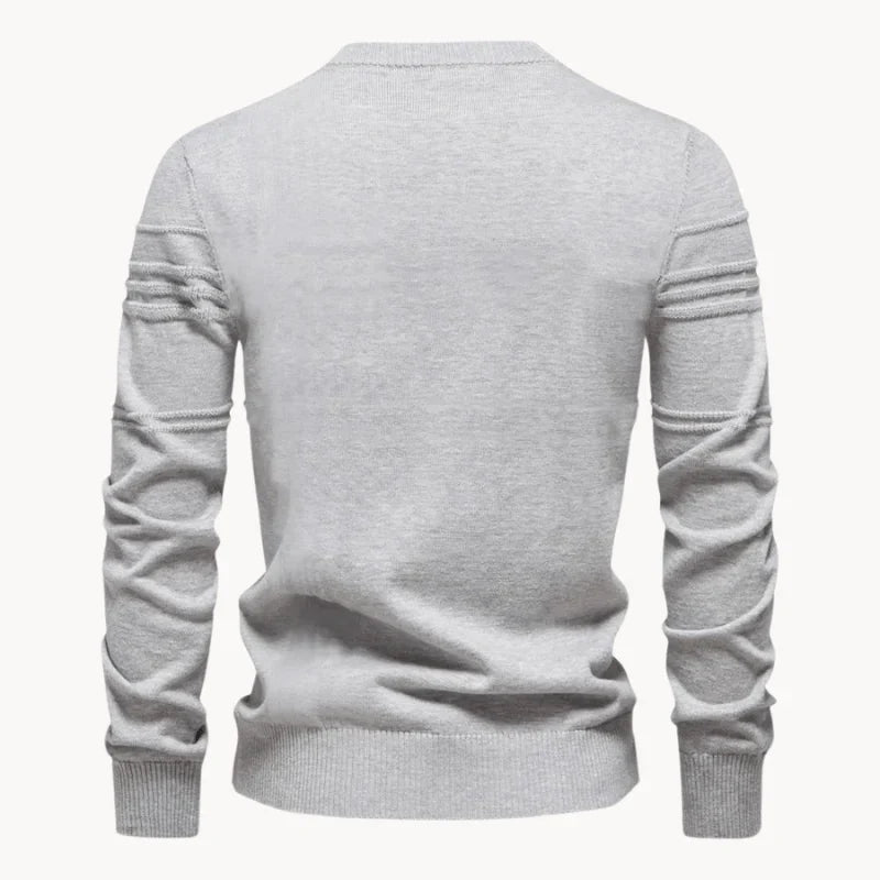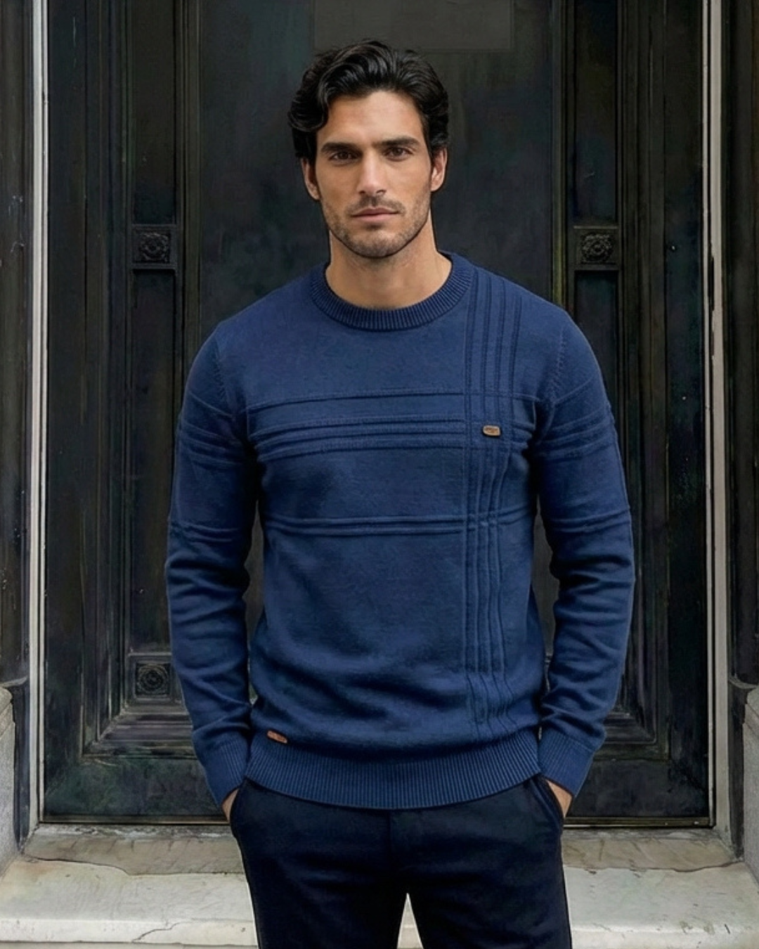 El diseño se basa en una cuadrícula asimétrica de líneas en relieve (punto de arroz o punto de grano) que se extienden horizontalmente por el pecho y las mangas, y verticalmente solo en un costado.
