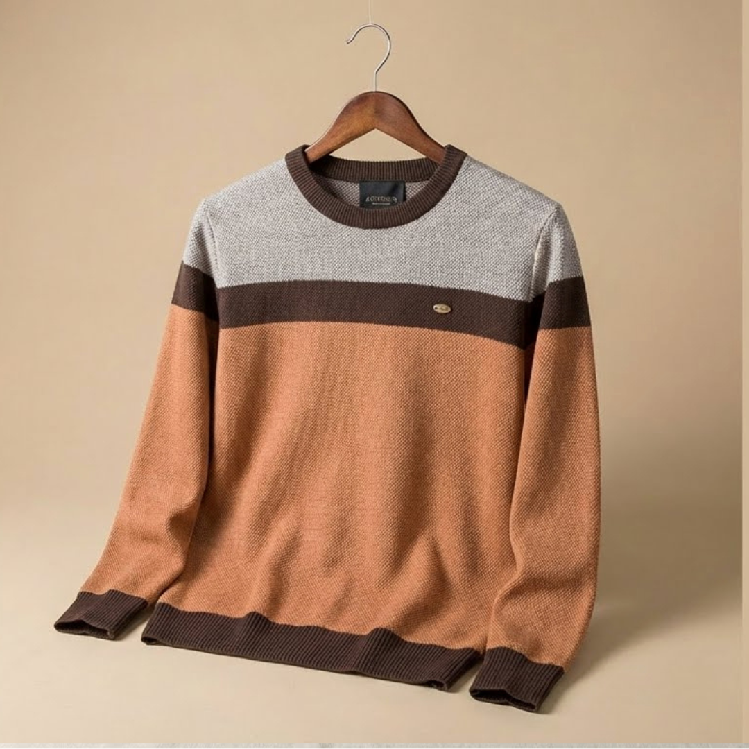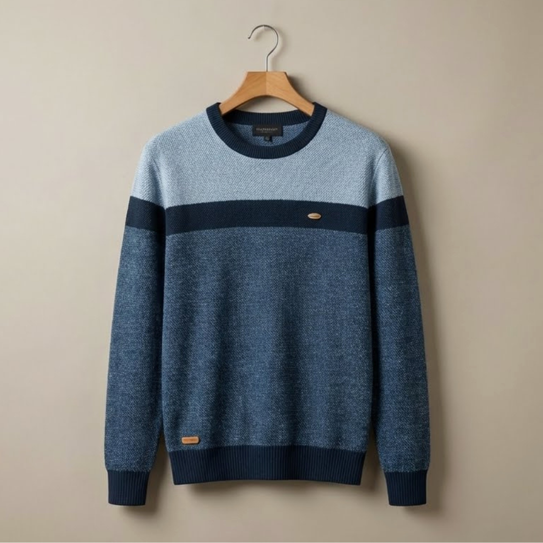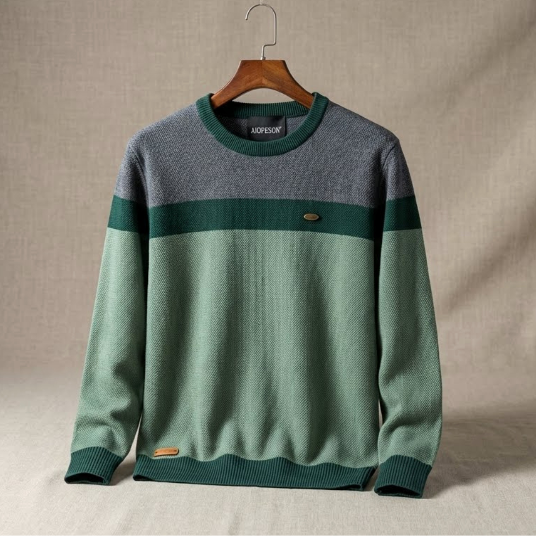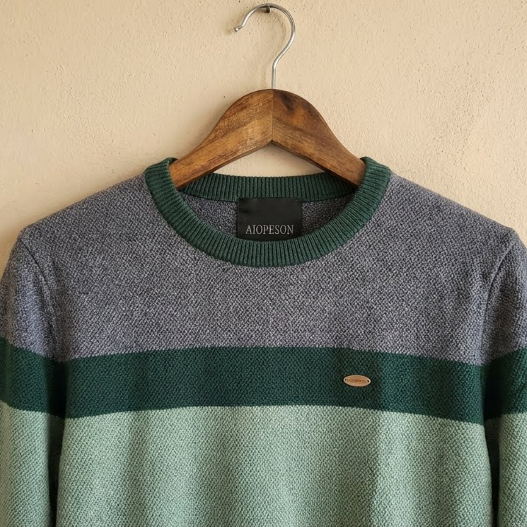 Este jersey presenta un diseño contemporáneo y equilibrado que combina texturas clásicas con una paleta de colores inspirada en la naturaleza. Es una prenda que proyecta sofisticación relajada, ideal para un estilo "casual premium".
