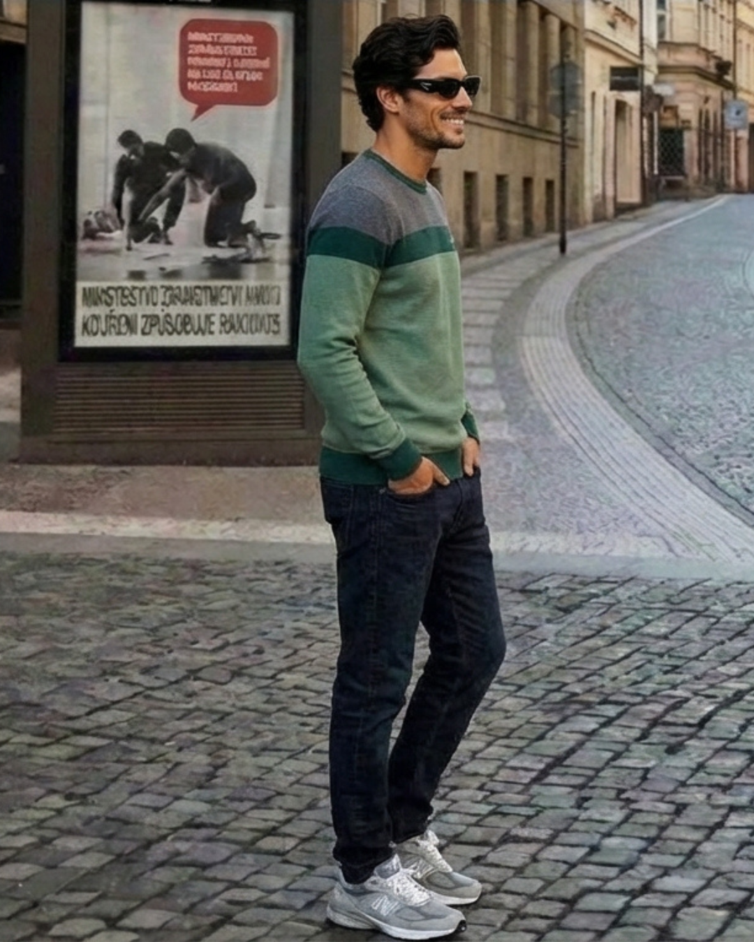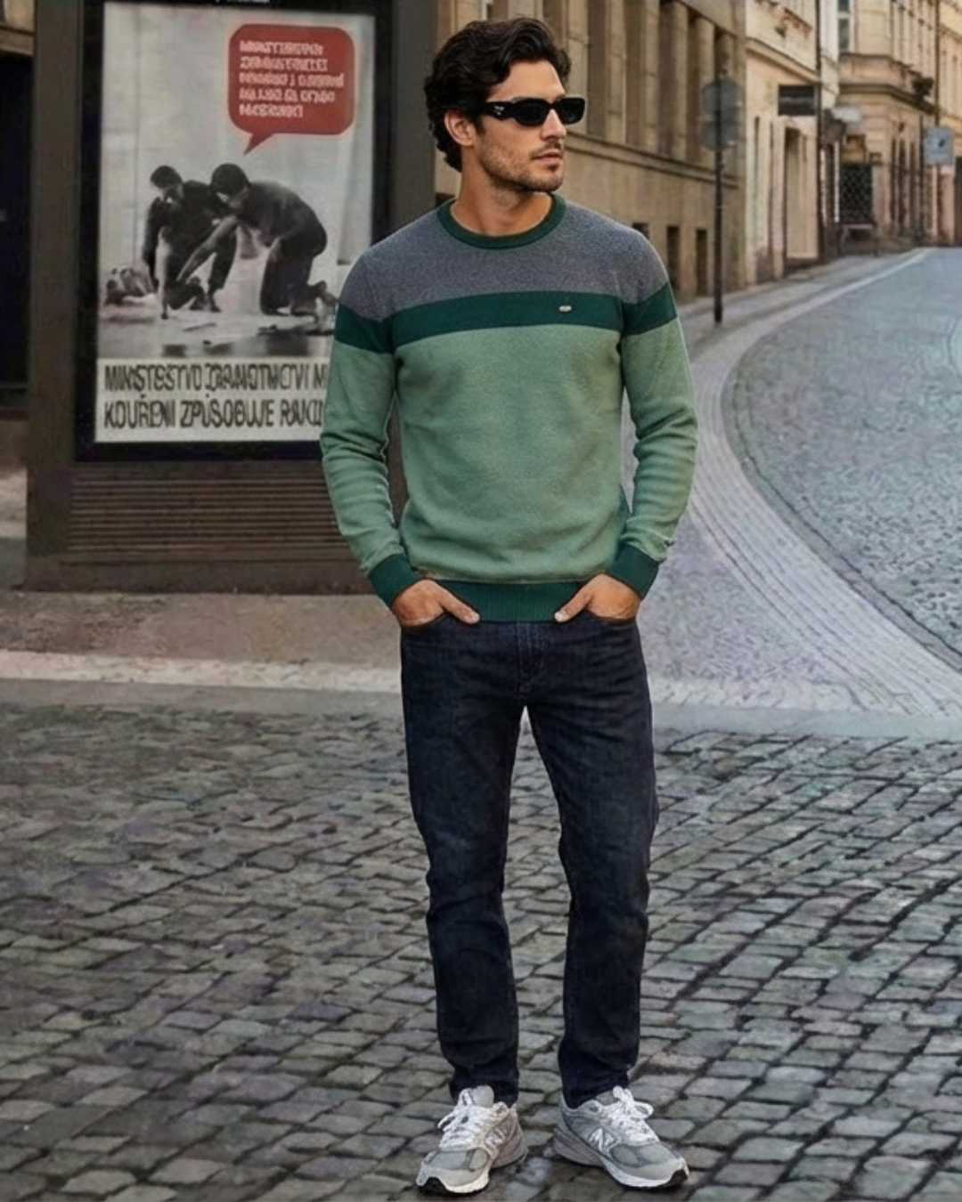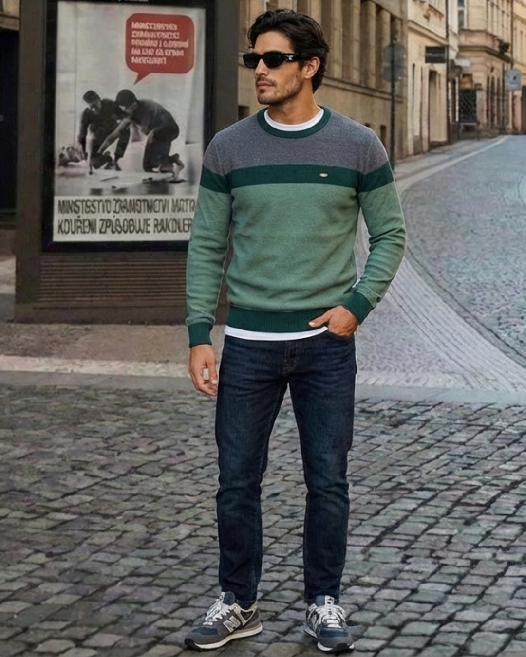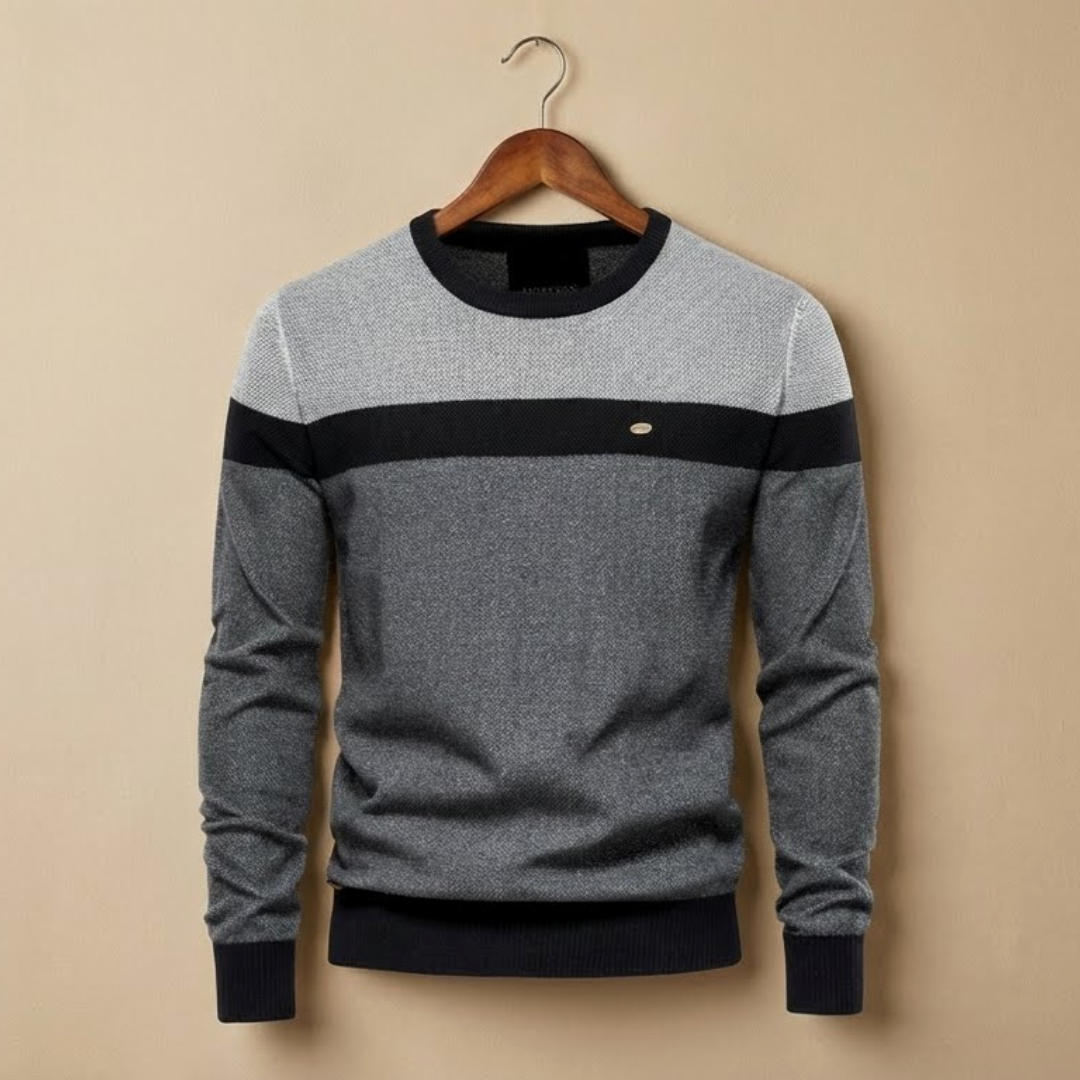 Este jersey presenta un diseño contemporáneo y equilibrado que combina texturas clásicas con una paleta de colores inspirada en la naturaleza. Es una prenda que proyecta sofisticación relajada, ideal para un estilo "casual premium".